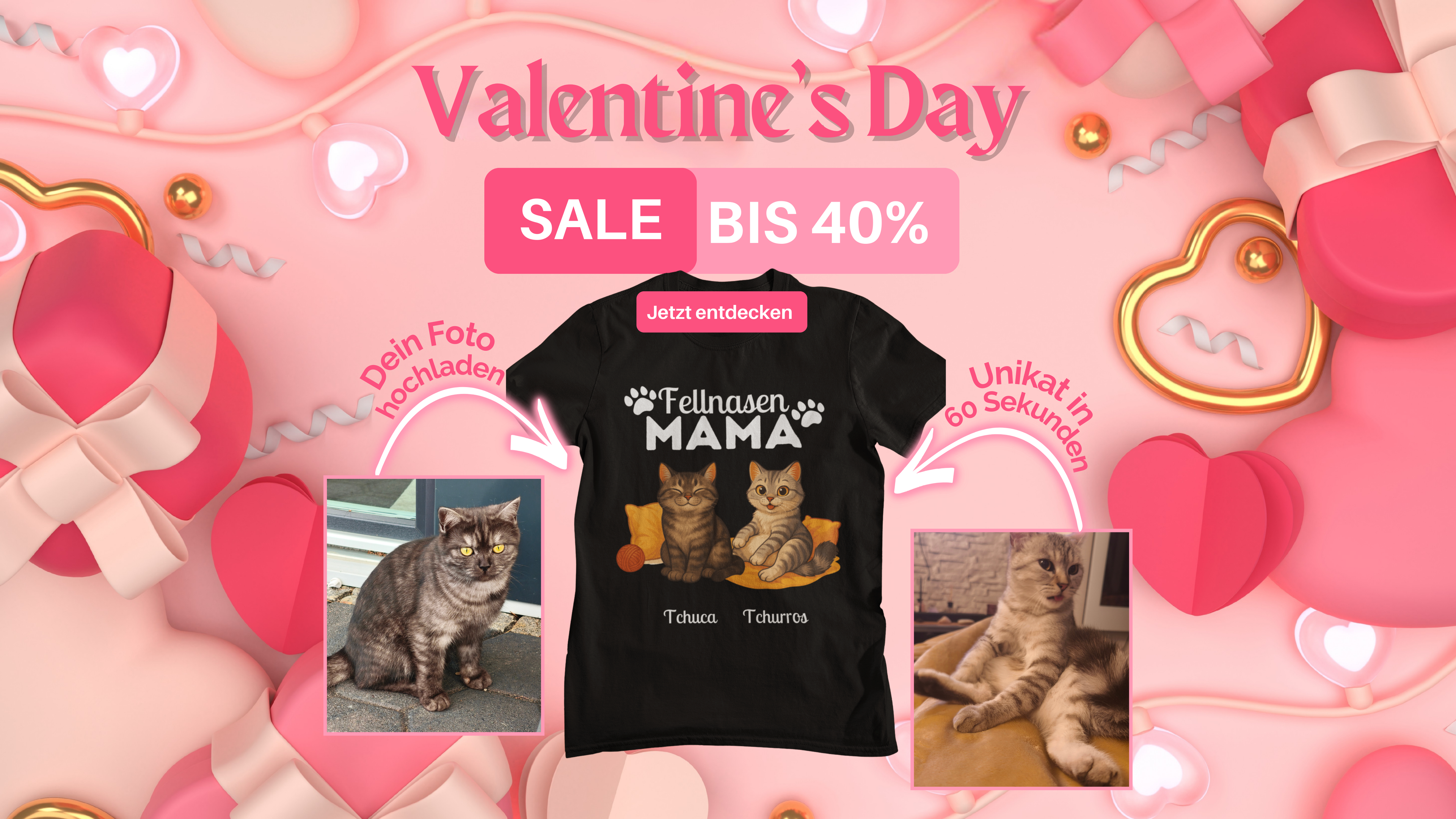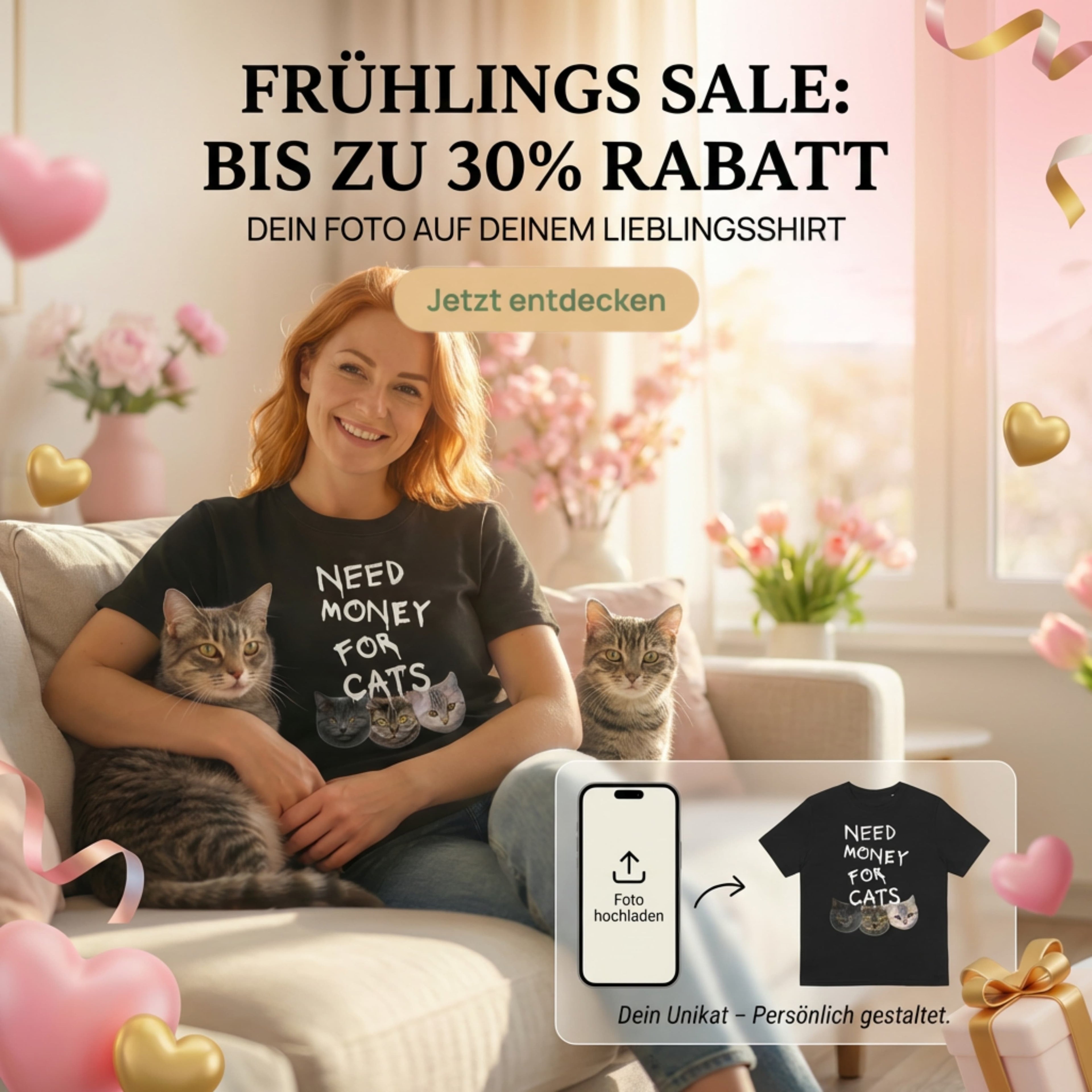 Du lädst ein Foto deiner Katze oder deines Hundes hoch. Unser promptbasierter Design-Workflow erstellt daraus anhand eigener Prompts ein individuelles Motiv, das die charakteristischen Merkmale deines Tieres aufgreift. Der Vorgang dauert etwa eine Minute, danach kannst du direkt bestellen.